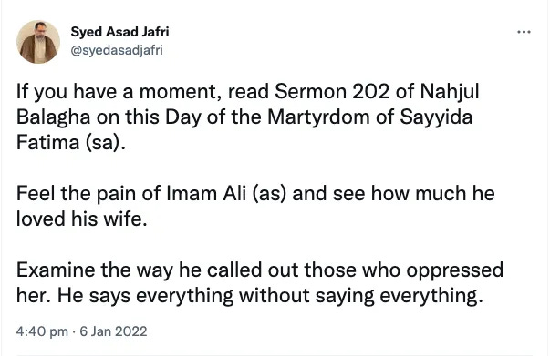 We had posted this picture of a quote from our esteemed scholar, Marhum Syed Asad Jafri last year during Fāṭimiyah. Little did we anticipate that this year, he would no longer be among us. Our prayers extend to him, hoping that his encouragement to explore the depths of the sermon, and thereby draw closer to Sayyidah Fāṭimah az-Zahrāʾ (ʿa), will gracefully accompany him in the afterlife. May his journey be adorned with the sublime proximity to Muḥammad and Aale Muḥammad (ʿa).