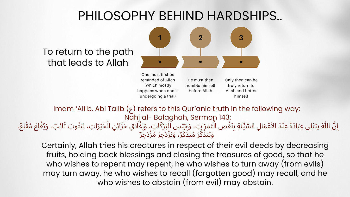 Certainly, Allah tries his creatures in respect of their evil deeds by decreasing fruits, holding back blessings and closing the treasures of good, so that he who wishes to repent may repent, he who wishes to turn away (from evils) may turn away, he who wishes to recall (forgotten good) may recall, and he who wishes to abstain (from evil) may abstain. (Nahj al-Balāghah, Sermon 143)