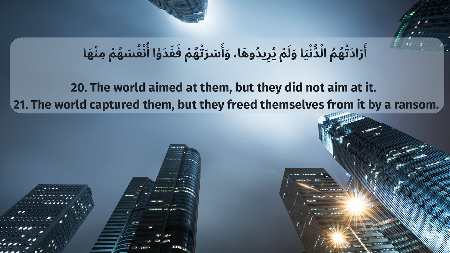 أَرَادَتْهُمُ الْدُّنْيَا وَلَمْ يُرِيدُوهَا، وَأَسَرَتْهُمْ فَفَدَوْا أُنْفُسَهُمْ مِنْهَا